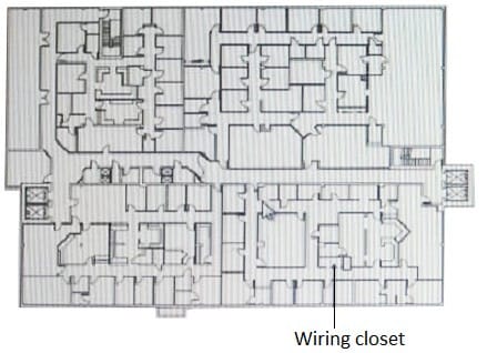 Each floor is about 100 feet (30 m) by 140 feet (43 m) with a 10 foot (3 m) ceiling. Interior walls are drywall. The layout for each floor is similar to that shown below. CAT5e cable is extended to all areas.