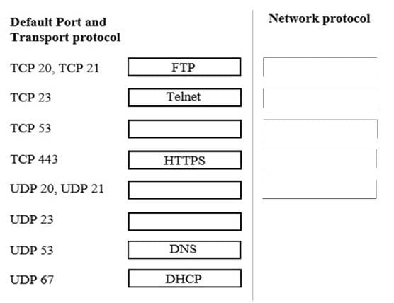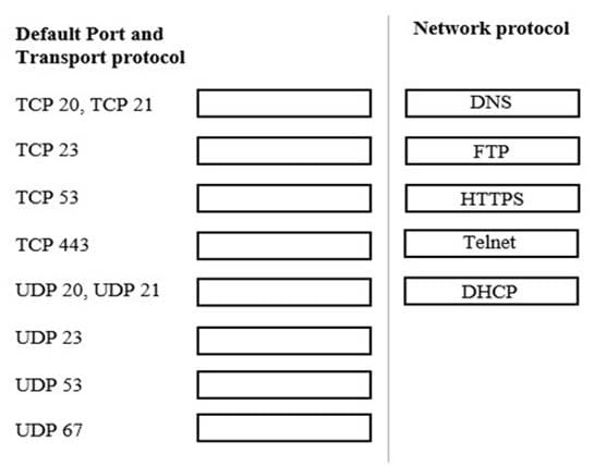 Match each network protocol to the correct default listening port and transport protocol. Not all answers will be used.