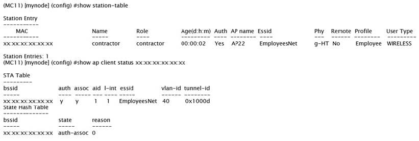 A network administrator wants to allow contractors to access the corporate WLAN named EmployeesNet with the contractor role in VLAN 40. When users connect, they do not seem to get an IP address. After some verification checks, the network administrator confirms the DHCP server (10.254.1.21) is reachable from the Mobility Controller (MC) and obtains the outputs shown in the exhibits.