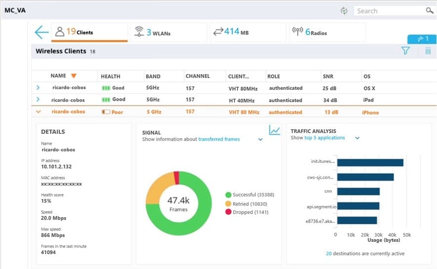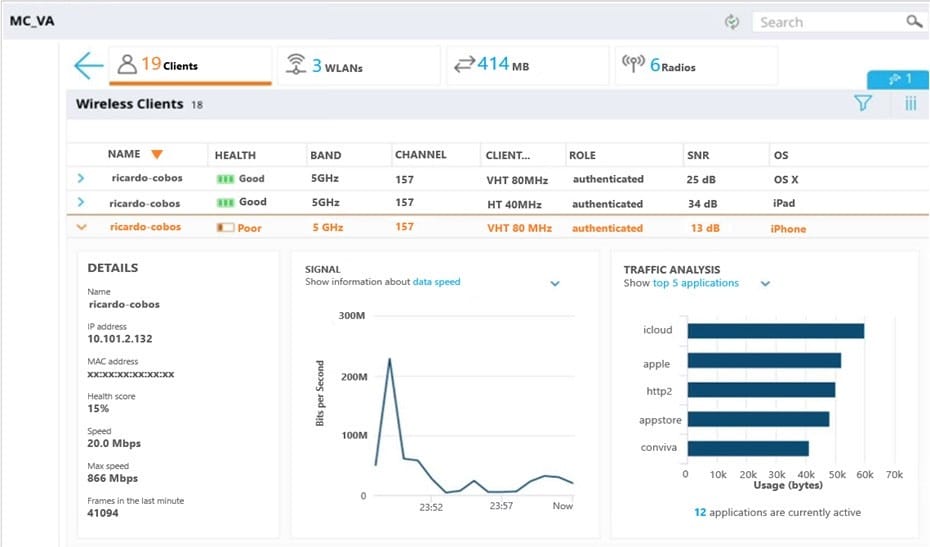 A user reports slow response time to a network administrator and suggests that there might be a problem with the WLAN. The user's phone supports 802.11ac in the 5 GHz band. The network administrator finds the user in the Mobility Master (MM) and reviews the output shown in the exhibit.