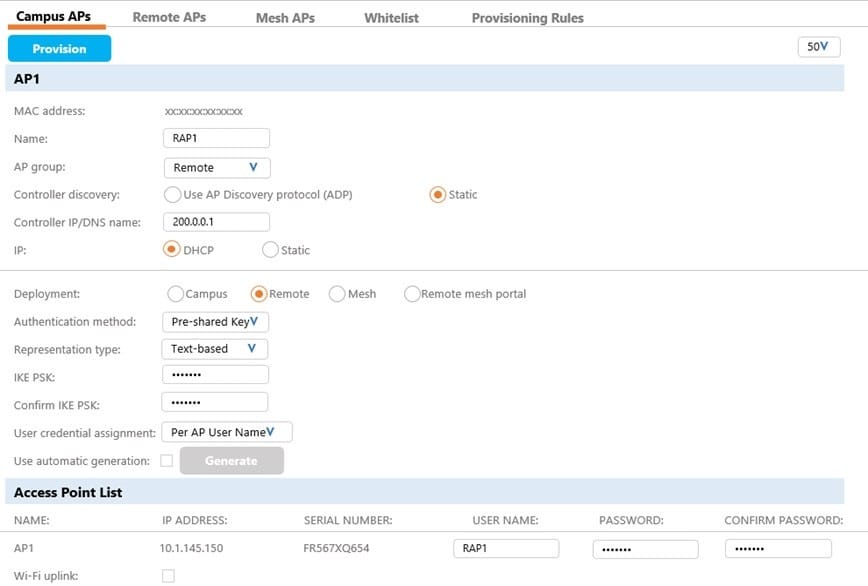A network administrator has a Mobility Master (MM) Mobility Controller (MC) architecture along with the MC in the DMZ for terminating RAPs. The network firewall has been provisioned to allow access to the MC in the DMZ for both UDP 500 and 4500. Then he proceeds to provision an AP as shown in the exhibit.