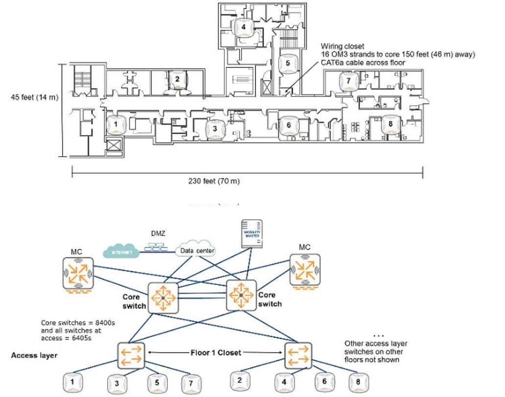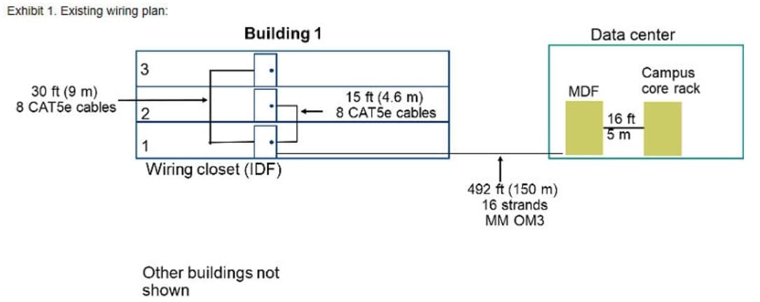 A customer has a building that needs a switch upgrade. The customer would like at least 20Gbps for the uplink bandwidth out of each closet. The building wiring plan is shown in Exhibit i. The customer will not consider any cabling upgrades at this point. The current proposal is shown in Exhibit 2.