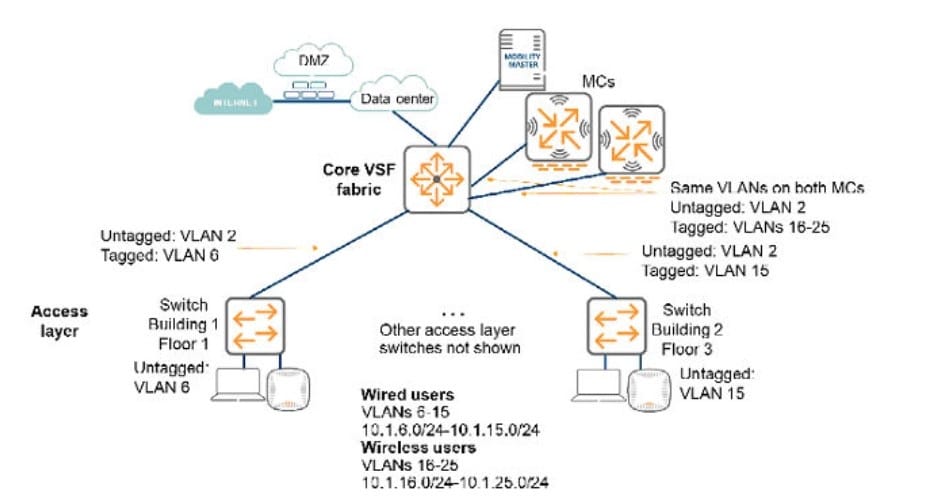 A customer requires a core switching solution for a very large multi-building campus with about 30;ooo wireless clients and devices. The network will have a flat topology as shown in the exhibit, and MCs will forward all wireless traffic to the