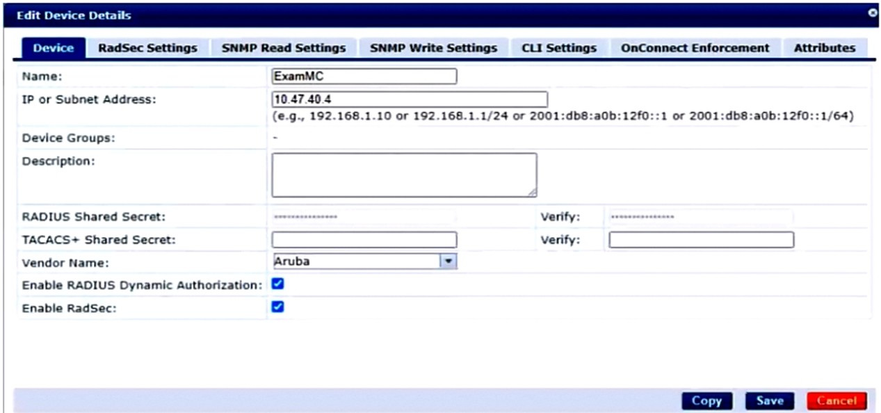 A company has an Aruba ClearPass server at 10.47.47.8, FQDN radius.acnsxtest.local. This exhibit shows ClearPass Policy Manager's (CPPM's) settings for an Aruba Mobility Controller (MC).