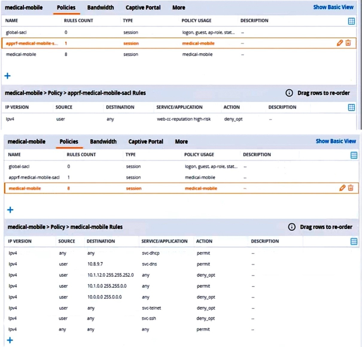 What is one of the changes that you must make to the policies to meet the scenario requirements? (In the options, rules in a policy are referenced from top to bottom. For example, "medical-mobile" rule 1 is "ipv4 any any svc-dhcp permit," and rule 8 is "ipv4 any any any permit'.)