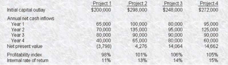 Capital Invest, Inc. uses a 12% hurdle rate for all capital expenditures and has done the following analysis for four projects for the upcoming year: