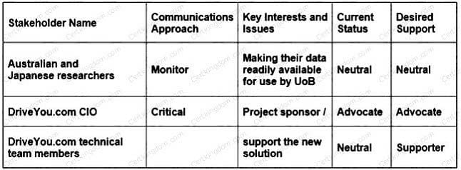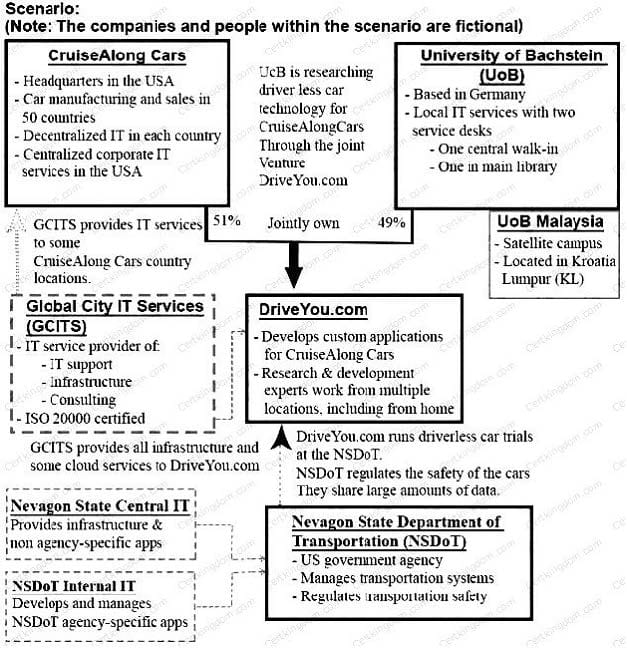 CruiseAlong Cars CruiseAlong Cars is a car manufacturing and sales company with corporate headquarters in the United States of America; It has grown by acquisition over the last 20 years and has operations in over 50 countries.Each country has its own IT organization, with some central corporate IT services provided by the US parent company. In some countries CruiseAlong Cars has outsourced infrastructure and service desks. The largest IT supplier is Global City IT Services (GCITS). In two countries GCITS provides CruiseAlong Cars with full outsourced services. They also provide selected services in other countries. Some of the issues that CruiseAlong Cars needs to address include: Inefficiencies caused by the current IT structure Inconsistency of IT services when employees are travelling CruiseAlong Cars is working with a European university (the University of Bachstein) to research and develop driverless car technology. The venture operates as an independent company called DriveYou.com, and CruiseAlong Cars owns a 51% share. DriveYou.com This is a small, innovative company, that is jointly owned by CruiseAlong Cars and the University of Bachstein (UoB). DriveYou.com develops custom applications using a highly collaborative, rapid and iterative development approach. Their employees are mostly research and development experts, working from multiple locations, with a significant number working from home. Initial driverless car testing is being conducted in the US at the Nevegon State Department of Transportation. Infrastructure and cloud services are purchased from Global City IT Services and other providers, and these relationships are managed by a DriveYou.com supplier manager. Some of the issues that DriveYou.com needs to address include: Better structure and accountability around their work practices Compliance with safety and other regulatory requirements. University of Bachstein (UoB) The UoB is a university that is based Germany, with a satellite campus in Kuala Lumpur, Malaysia; In the past, some IT services were funded and run centrally, and some were funded and run independently by each faculty. Centrally owned services include a `walk-in' service desk, plus a separate service desk in the main library, run by library staff. Library services and IT are both part of the university's administrative services division. Recently, under a new CIO, there has been a drive to centralize and consolidate IT as a corporate function, although this has not been fully achieved. The central IT department runs a variety of legacy systems, which serve students, administrators, researchers and academics. It also runs some high performance computing systems and high bandwidth networks across the main campus area; Some of the issues that the UoB needs to address include: Complete the centralization and consolidation of IT Manage growth and increasing IT demand Demonstrate value through competitive, responsive and transparent services Global City Services (GCITS) GCITS is a global service provider which has grown through acquisition and which offers a wide range of services, including IT support, infrastructure and consulting. GCITS has mature and efficient IT service management processes, and holds an ISO/IEC 20000 certification. GCITS provides the entire infrastructure and some cloud services for DriveYou.com, as well as a range of services in different countries to CruiseAlong Cars.Some of the issues that GCITS needs to address include: Succeed in establishing a strategic partnership with CruiseAlong Cars Nevagon State Department of Transportation (NSDoT) NSDot is a government agency in the US state of Nevagon, where DriveYou.com is running their trials. It is responsible for managing transportation systems and safety. DriveYou.com must work with the agency to ensure that their trials comply with safety regulations, and the program includes bi0directional sharing of large amounts of data; The NSDoT's internal IT team writes and manages most of their agency-specific applications, however most other applications and infrastructure are provided by the Nevagon State central IT department. DriveYou.com decided to move the storage and management of their testing data to a new platform so that they can share it more effectively with the UoB. They also need to facilitate data transfer from new CruiseAlong Cars research facilities in Japan and Australia; The DriveYou.com project manager needs to establish an effective channel of communication with CruiseAlong Cars' new research facilities. There is already a plan for communicating with other stakeholders.