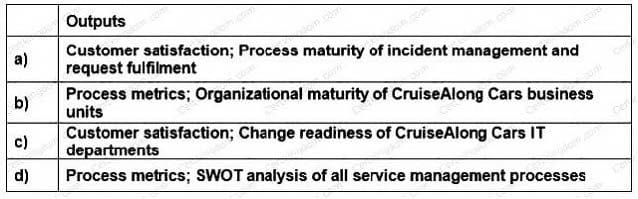 CruiseAlong Cars CruiseAlong Cars is a car manufacturing and sales company with corporate headquarters in the United States of America; It has grown by acquisition over the last 20 years and has operations in over 50 countries.Each country has its own IT organization, with some central corporate IT services provided by the US parent company. In some countries CruiseAlong Cars has outsourced infrastructure and service desks. The largest IT supplier is Global City IT Services (GCITS). In two countries GCITS provides CruiseAlong Cars with full outsourced services. They also provide selected services in other countries. Some of the issues that CruiseAlong Cars needs to address include: Inefficiencies caused by the current IT structure Inconsistency of IT services when employees are travelling CruiseAlong Cars is working with a European university (the University of Bachstein) to research and develop driverless car technology. The venture operates as an independent company called DriveYou.com, and CruiseAlong Cars owns a 51% share. DriveYou.com This is a small, innovative company, that is jointly owned by CruiseAlong Cars and the University of Bachstein (UoB). DriveYou.com develops custom applications using a highly collaborative, rapid and iterative development approach. Their employees are mostly research and development experts, working from multiple locations, with a significant number working from home. Initial driverless car testing is being conducted in the US at the Nevegon State Department of Transportation. Infrastructure and cloud services are purchased from Global City IT Services and other providers, and these relationships are managed by a DriveYou.com supplier manager. Some of the issues that DriveYou.com needs to address include: Better structure and accountability around their work practices Compliance with safety and other regulatory requirements. University of Bachstein (UoB) The UoB is a university that is based Germany, with a satellite campus in Kuala Lumpur, Malaysia; In the past, some IT services were funded and run centrally, and some were funded and run independently by each faculty. Centrally owned services include a `walk-in' service desk, plus a separate service desk in the main library, run by library staff. Library services and IT are both part of the university's administrative services division. Recently, under a new CIO, there has been a drive to centralize and consolidate IT as a corporate function, although this has not been fully achieved. The central IT department runs a variety of legacy systems, which serve students, administrators, researchers and academics. It also runs some high performance computing systems and high bandwidth networks across the main campus area; Some of the issues that the UoB needs to address include: Complete the centralization and consolidation of IT Manage growth and increasing IT demand Demonstrate value through competitive, responsive and transparent services Global City Services (GCITS) GCITS is a global service provider which has grown through acquisition and which offers a wide range of services, including IT support, infrastructure and consulting. GCITS has mature and efficient IT service management processes, and holds an ISO/IEC 20000 certification. GCITS provides the entire infrastructure and some cloud services for DriveYou.com, as well as a range of services in different countries to CruiseAlong Cars. Some of the issues that GCITS needs to address include: Succeed in establishing a strategic partnership with CruiseAlong Cars Nevagon State Department of Transportation (NSDoT) NSDot is a government agency in the US state of Nevagon, where DriveYou.com is running their trials. It is responsible for managing transportation systems and safety. DriveYou.com must work with the agency to ensure that their trials comply with safety regulations, and the program includes bi0directional sharing of large amounts of data; The NSDoT's internal IT team writes and manages most of their agency-specific applications, however most other applications and infrastructure are provided by the Nevagon State central IT department. CruiseAlong Cars is planning to improve the provision and support of IT services for senior executives who travel. They will deploy new mobile technology to enhance the user experience. They will also improve the incident management and request fulfilment processes and standardize these across service desks. They are taking an iterative approach and have released the first iteration of improvements. A project manager has been appointed for this improvement initiative. The project manager is planning an assessment to verify that the improvements have been achieved in the first iteration of the project.