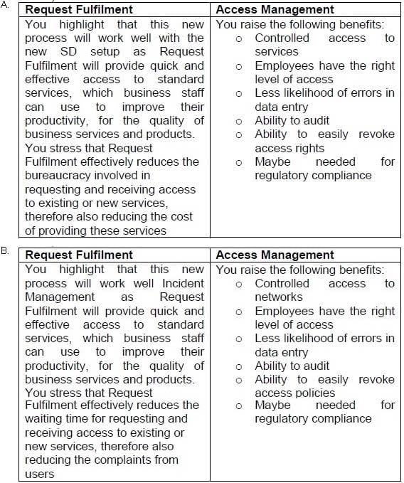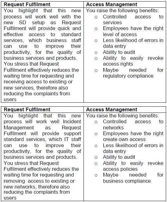 There is some confusion as to how the process of AccessManagement should be designed. In particular, there is debate as tohow the process should be integrated into the overall approach of ITService Management within Vision Media. The IT director has askedfor submissions from some of her staff, describing how they thinkAccess Management should be designed.