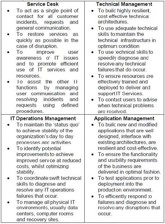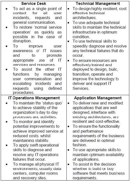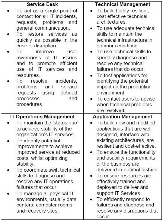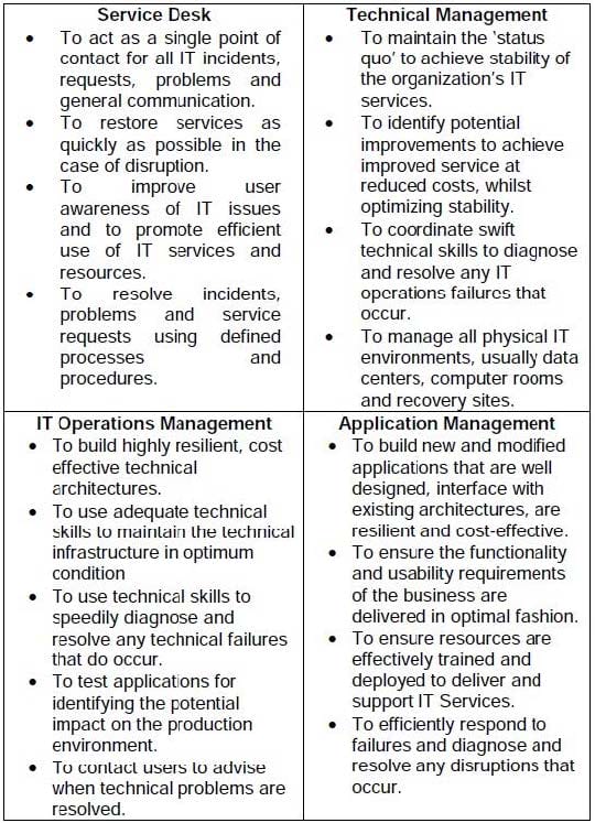The IT director is now considering the implementation of the ServiceOperation functions. However there seems to be overlap between thegoals and objectives for each of the functions, which is causing someconcern among staff involved in the project. Which of the following responses BEST describes the objectives ofthe four Service Operation functions?