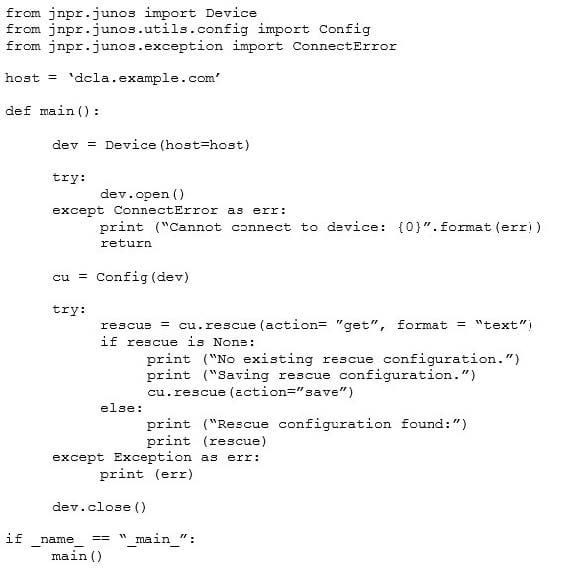 Which two actions are performed by the PyEZ Python script shown in the exhibit? (Choose two.)