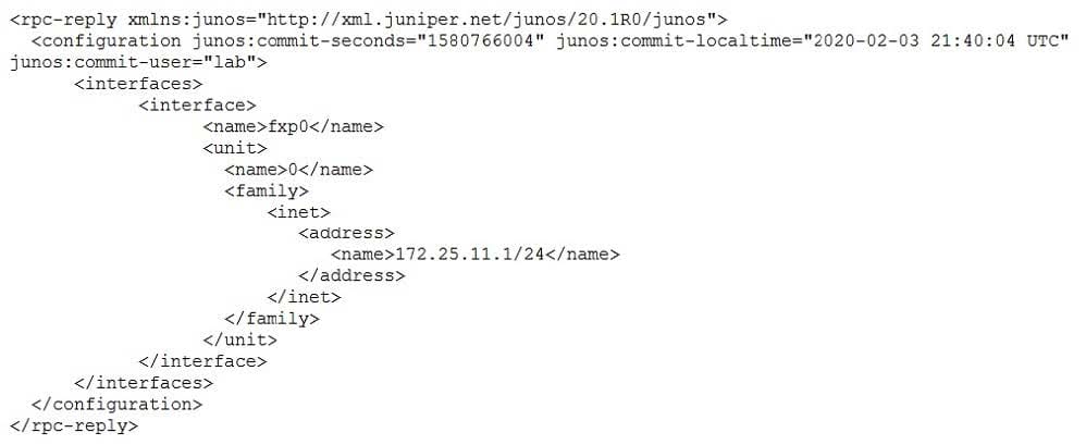 In the XML output shown in the exhibit, what is the full XPath for the IP address of the interface?