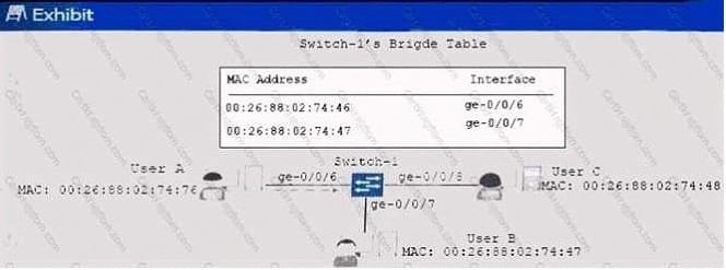 Click the Exhibit button. Switch-1 in the exhibit receives a packet from User A with a destination MAC address of