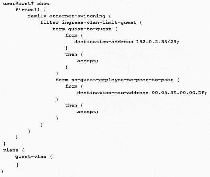 A recent security audit indicates that peer-to-peer applications are allowed on the guest VLAN and employees may have been using the guest VLAN for this purpose. You deploy the configuration shown in the exhibit, but it does not stop the peer-to-peer traffic.