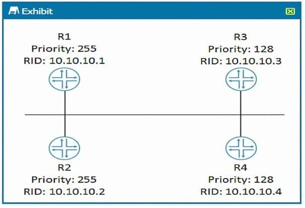 Referring to the exhibit, which router becomes the OSPF DR when all routers are powered on at the same time?