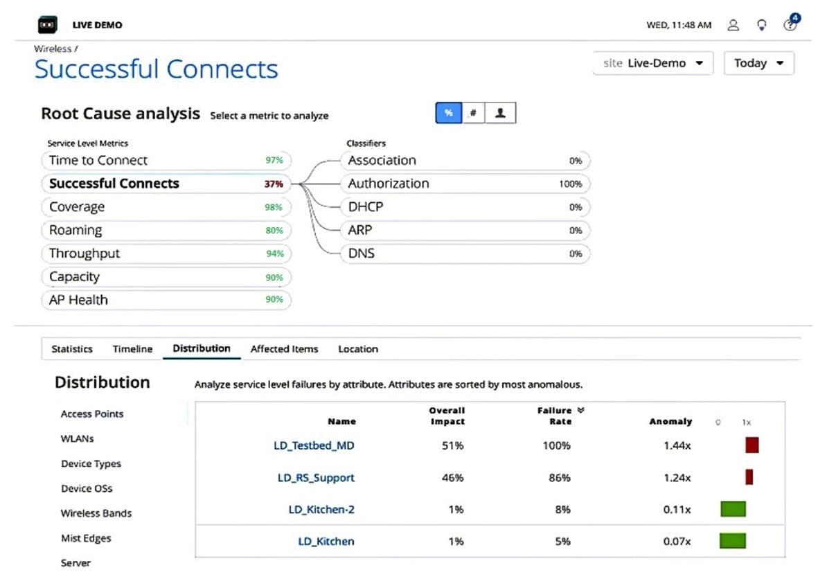 Referring to the exhibit, which percentage of connection attempts failed on the access point named LD_RS_Support?