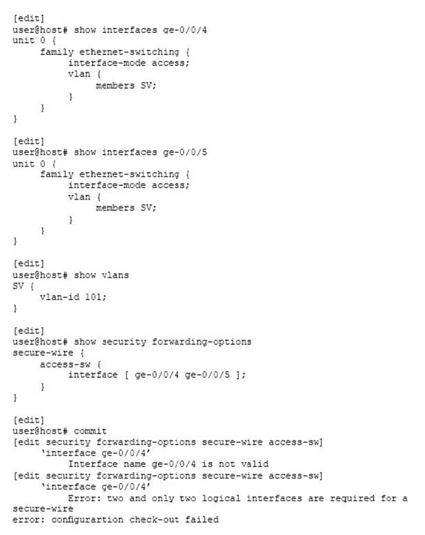 You are trying to implement secure wire on your SRX Series device. However, you are receiving the commit error shown in the exhibit.