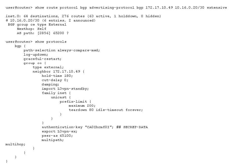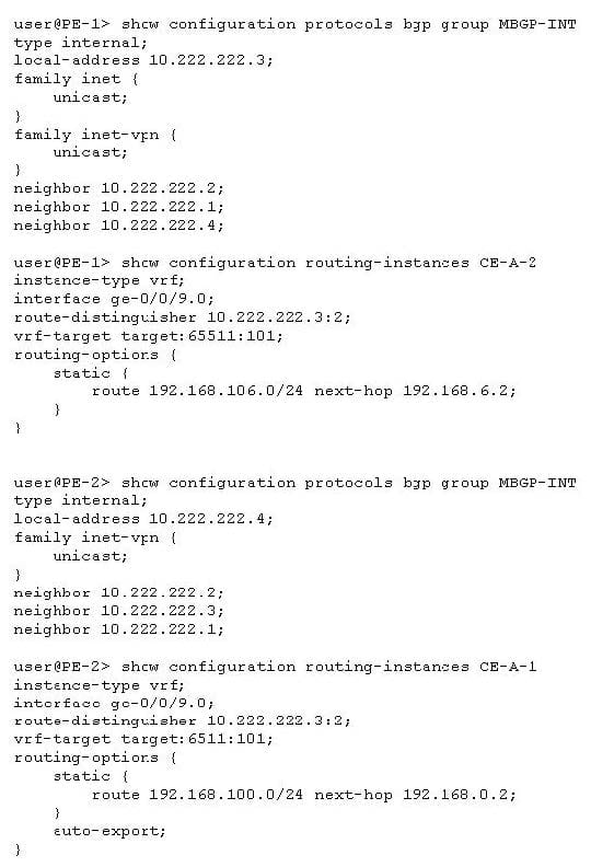 The customer's hosts cannot communicate across their Layer 3 VPN. The exhibit shows the configuration for the two PE devices in the Layer 3 VPN.