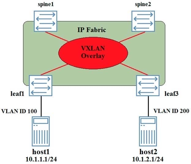 You have deployed a VXLAN as shown in the exhibit Leaf1, leaf3, spine1, and spine2 have been configured as VTEPs. Host1 cannot communicate with host2.
