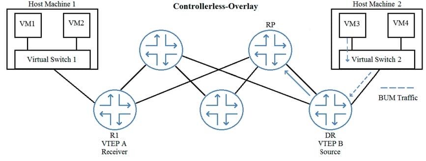 In the exhibit, VM1 is part of the same VXLAN segment as VM3.