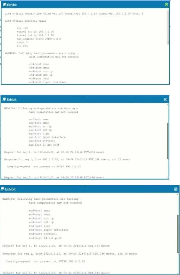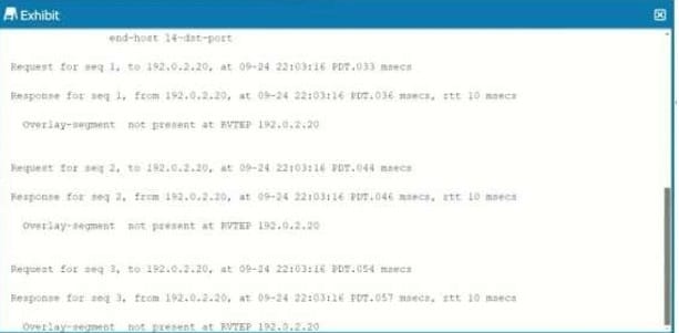 You are troubleshooting a connectivity issue across a VXLAN overlay network. In the exhibit, you are using the ping overlay command from a local VTEP residing on a OFX 5120 to a remote VTEP residing on a separate QFX5120.