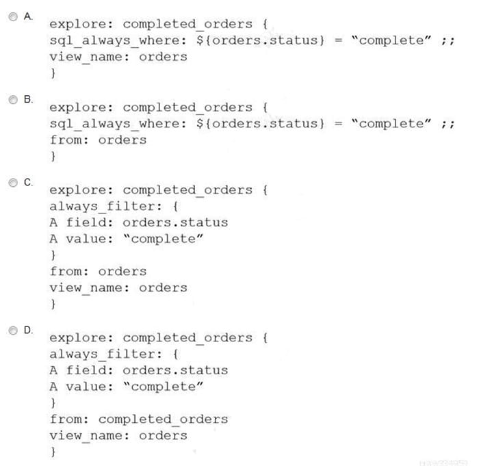 A developer needs to add an Explore built off of the orders view, which surfaces only completed orders. An orders Explore exists that contains all order information. Fields from the orders view are also referenced in other existing views such as ${orders.fieldname}.