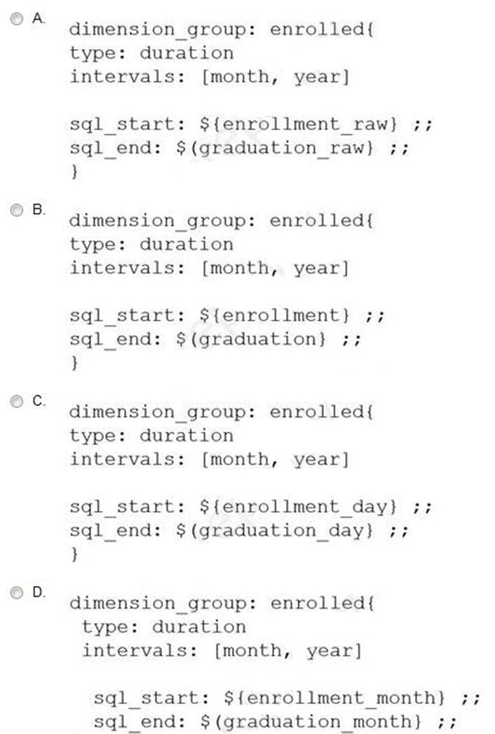 A developer has the dimensions enrollment_month and graduation_month already defined in the view. Both were created as part of dimension_groups of type: time. The developer need to use these two dimensions in the sql_start and sql_end parameters of a dimension group of type: duration.