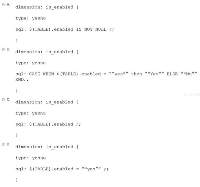 A developer would like to add a new dimension of type: yesno for the enabled column in their users table. The column is of type: string in the database and returns yes and no values.