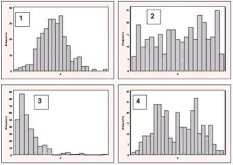 B. 1-Normal, 2-Uniform, 3-Exponential, 4-Bimodal