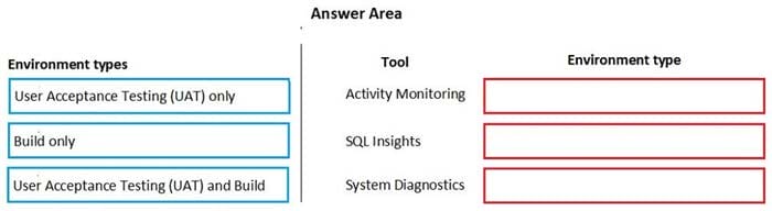 Which Lifecycle Services (LCS) tools should you use for each environment? To answer, drag the appropriate environment types to the correct tools. Each environment type may be used once, more than once, or not at all. You may need to