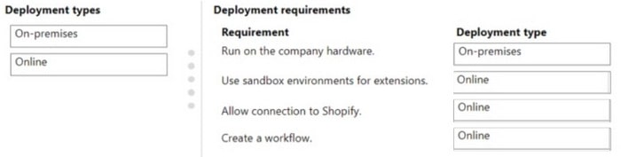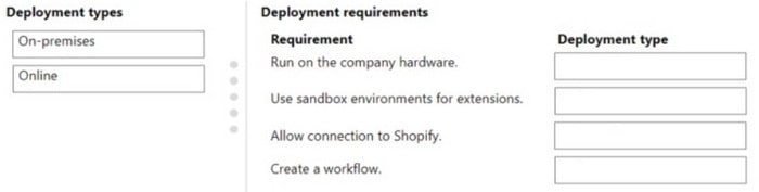 Which deployment types should you use? To answer, move the appropriate deployment types to the correct requirements. You may use each deployment type once, more than once, or not at all.