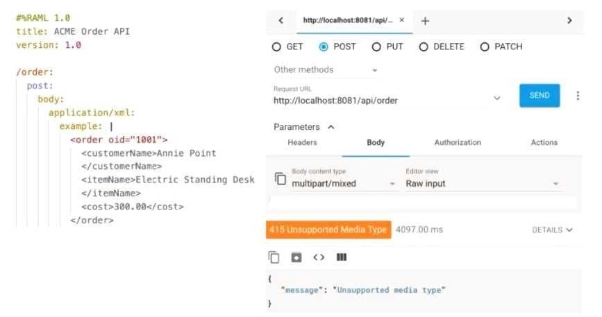 The web client sends a POST request to the ACME Order API with an XML payload. An error is returned. What should be changed in the request so that a success response code is returned to the web client?
