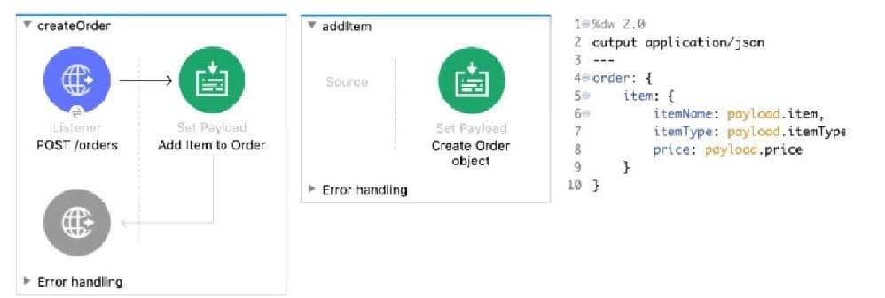 Refer to the exhibits. The Set Payload transformer in the addltem child flow uses DataWeave to create an