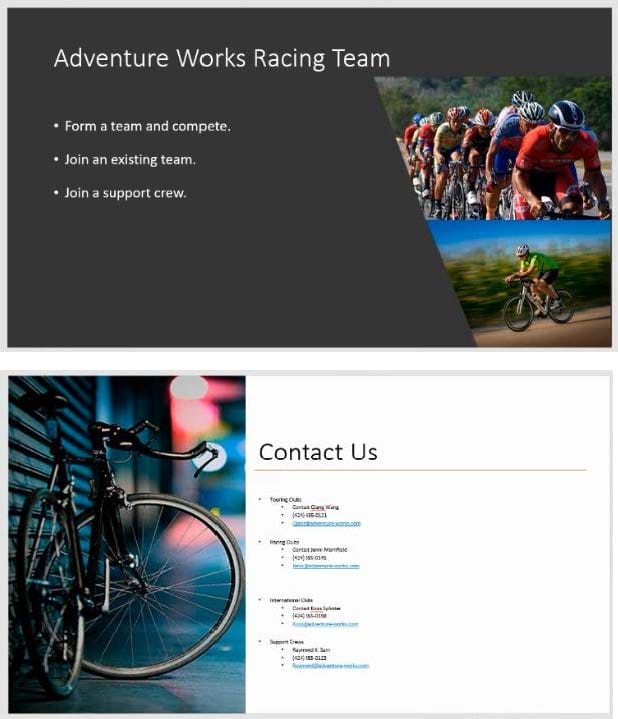 On the ‘’Extra Activities’’ slide, insert a row at the end of the table. In the row, enter ‘’Sporting Event’’ in the ‘’Event’’ column and ‘’$175’’ in the ‘’Price’’ column.