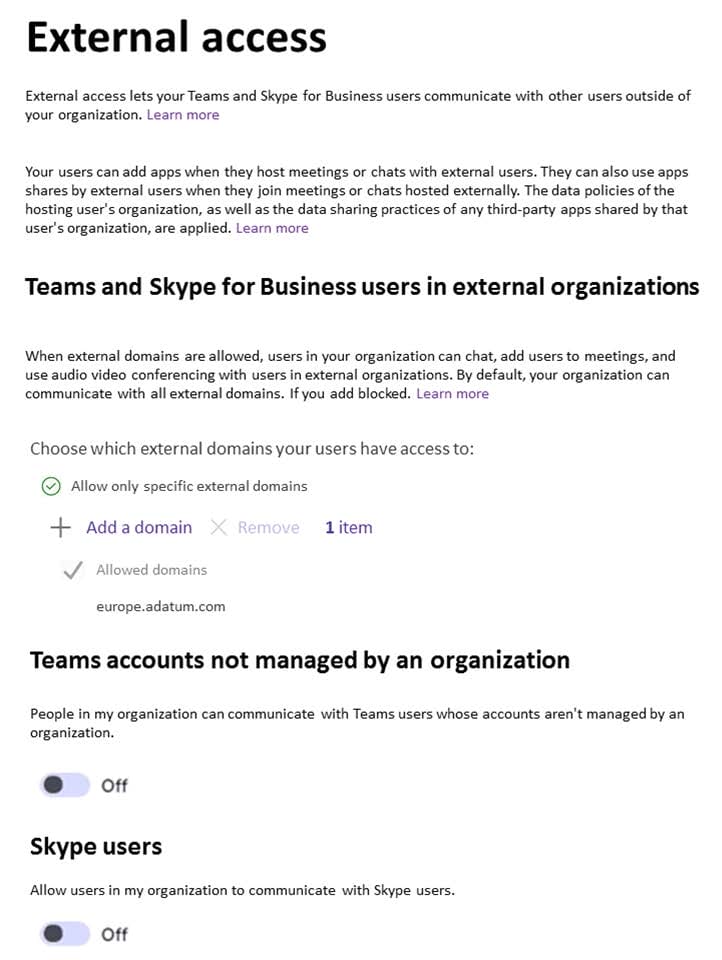 The External access settings in Microsoft Teams are configured as shown in the following exhibit.