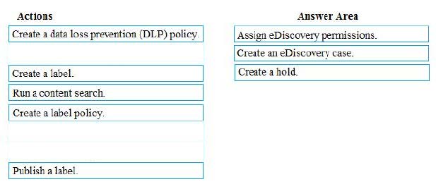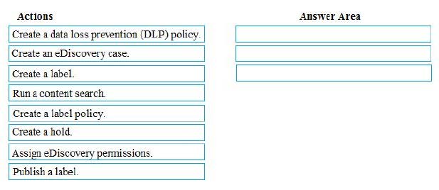 Which three actions should you perform in sequence from the Security and Compliance admin center? To answer, move the appropriate actions from the list of actions to the answer area and arrange them in the correct order.