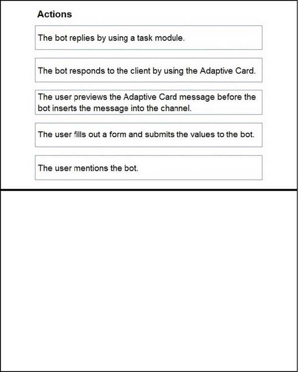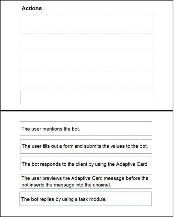 In which order will a user and the bot interact? To answer, move all actions from the list of actions to the answer area and arrange them in the correct order.