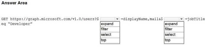 How should you complete the Microsoft Graph API query? To answer, select the appropriate options in the answer area.