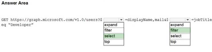 You need to identify all users who have a job title of Developer. The solution must return only the display name and email address attributes of the users.