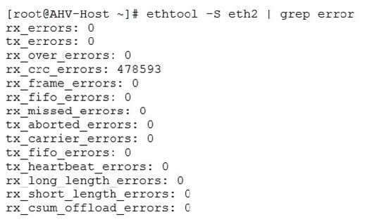 An administrator receives an alert in Prism indicating that interface eth2, on an AHV host is receiving many CRC errors. After togging into the problematic host, the following command is run to show the indicated output: