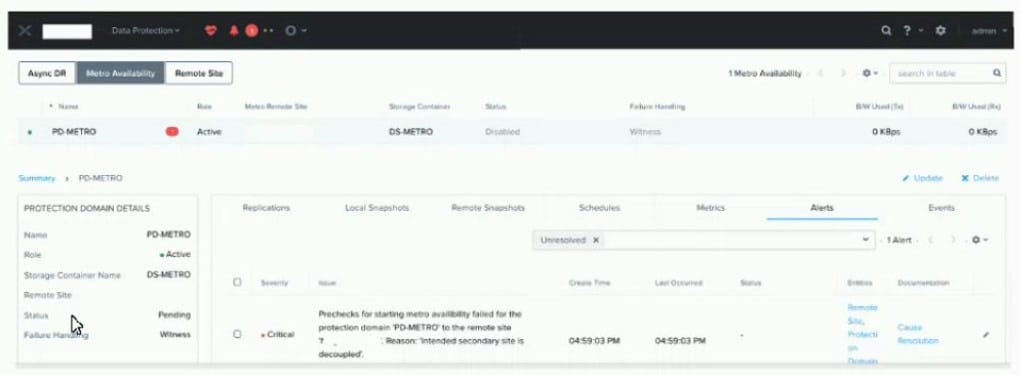 An administrator notices a critical alert on the Metro Availability Protection Domain What is causing this alert?