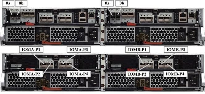 B. Insert a cable from right controller port 0a to the IOMB square, and from port 0b to the IOMA circle.