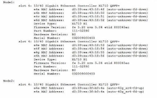 A customer wants to connect a NetApp AFF A700 system to a 40GbE switch. The controllers have a 10/40G Ethernet card in slot 4 for this purpose. The link comes up fine on node 2,but it will not come up on node 1. You look at the AutoSupport data for the nodes in question and see the output shown in the exhibit.