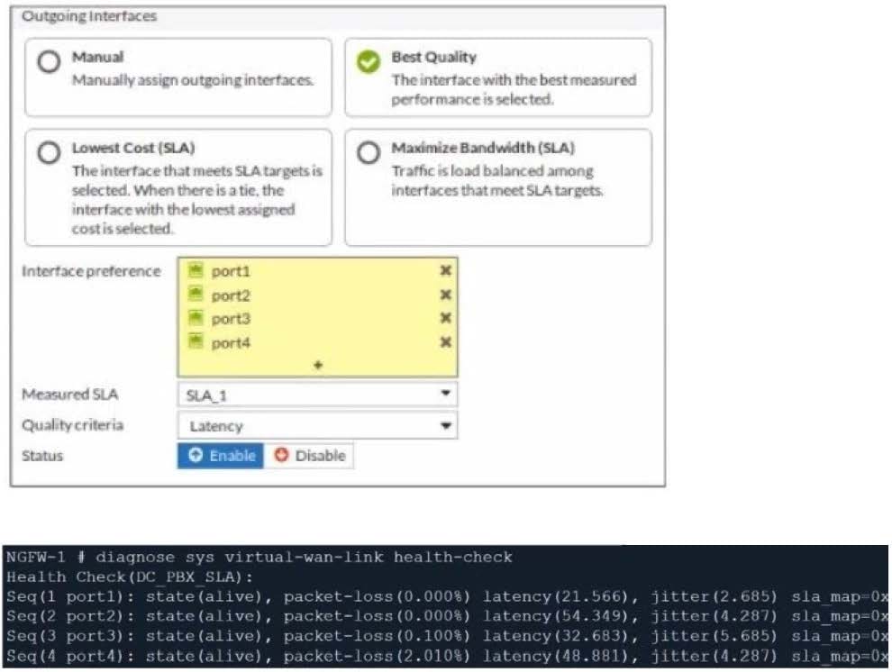 The exhibit contains the configuration for an SD-WAN Performance SLA, as well as the output of diagnose sys virtual-wan-link health-check. Which interface will be selected as an outgoing interface?