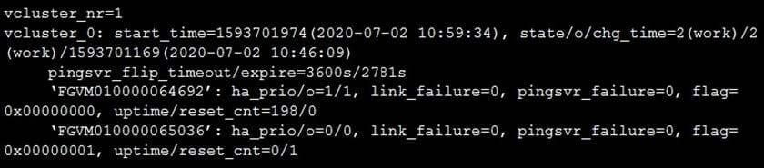 The exhibit displays the output of the CLI command: diagnose sys ha dump-by vcluster.