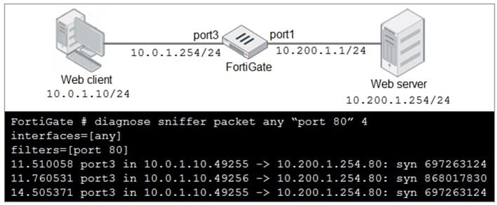 In the network shown in the exhibit, the web client cannot connect to the HTTP web server. The administrator runs the FortiGate built-in sniffer and gets the output as shown in the exhibit.