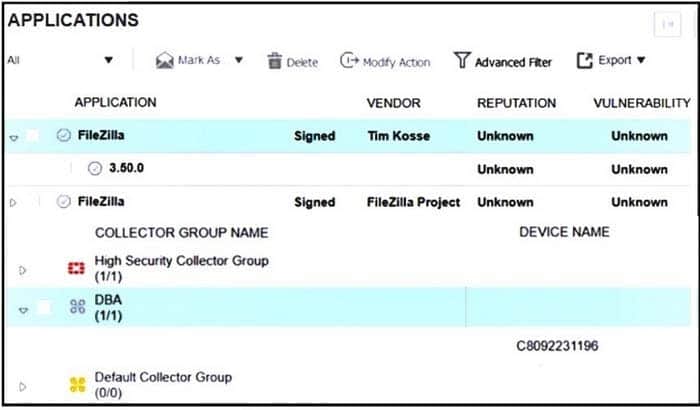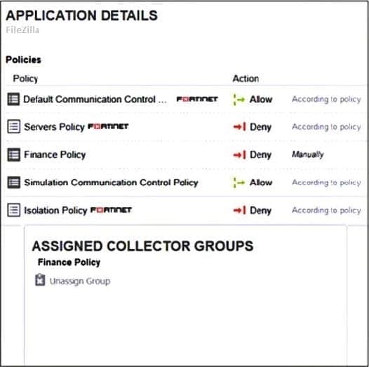 The exhibits show application policy logs and application details Collector C8092231196 is a member of the Finance group What must an administrator do to block the FileZilia application?