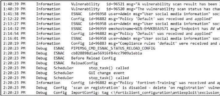 Based on the FortiClient logs shown in the exhibit which endpoint profile policy is currently applied to the FortiClient endpoint from the EMS server?