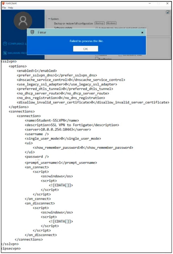 An administrator has restored the modified XML configuration file to FortiClient and sees the error shown in the exhibit.