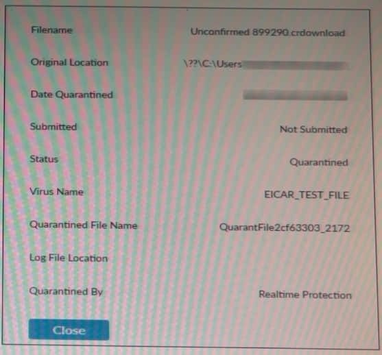 A. The file status is Quarantined